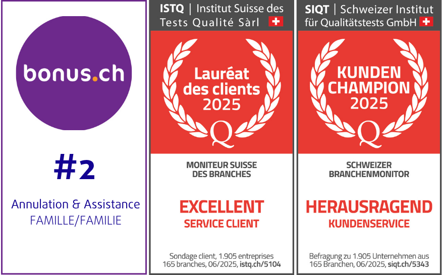 - Essential dès 46 CHF avec les prestations de base : annulation et assistance médicale (aide d'urgence, rapatriement) dans le monde entier.